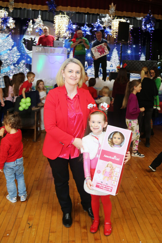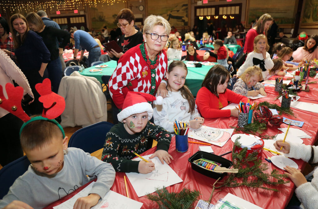Okazało się, że on również uwielbia zabawę i dołączył do dzieci. Szybko zrobił tzw. pociąg i po kilkukrotnym przemierzeniu całej sali zatrzymał się na stacji, którą był ogromny fotel przeznaczony właśnie dla niego. Późnej emocje sięgnęły zenitu bowiem rozpoczęło się wręczanie prezentów i robienie sobie wspólnych zdjęć. Trwało to ponad godzinę, po czym Święty Mikołaj znów zaczął szaleć na parkiecie wraz z maluchami. Gdy wszyscy opadli z sił, przed sceną zebrała się spora grupa dzieci, które wcześniej brały udział w konkursie plastycznym “Rysunek z Mikołajem” przeprowadzonym przez Krystynę Pitułę i Martę Śmigielską. Cieszył się on ogromnym zainteresowaniem i miał bardzo wysoki poziom. Najciekawsze i najładniejsze prace zostały nagrodzone upominkami. Otrzymali je: Mia Kurylak, Rozalia Łaźnia i Amelia Zygmunt (grupa 4- i 5-latków), Dominik Bańka, Zoe Rostek, Sofia Ochua i Amelia Łaźnia (grupa 6- i 7-latków) oraz Emily Warchoł, Julia Zygmunt i Maya Niedbała (grupa powyżej 8 lat).