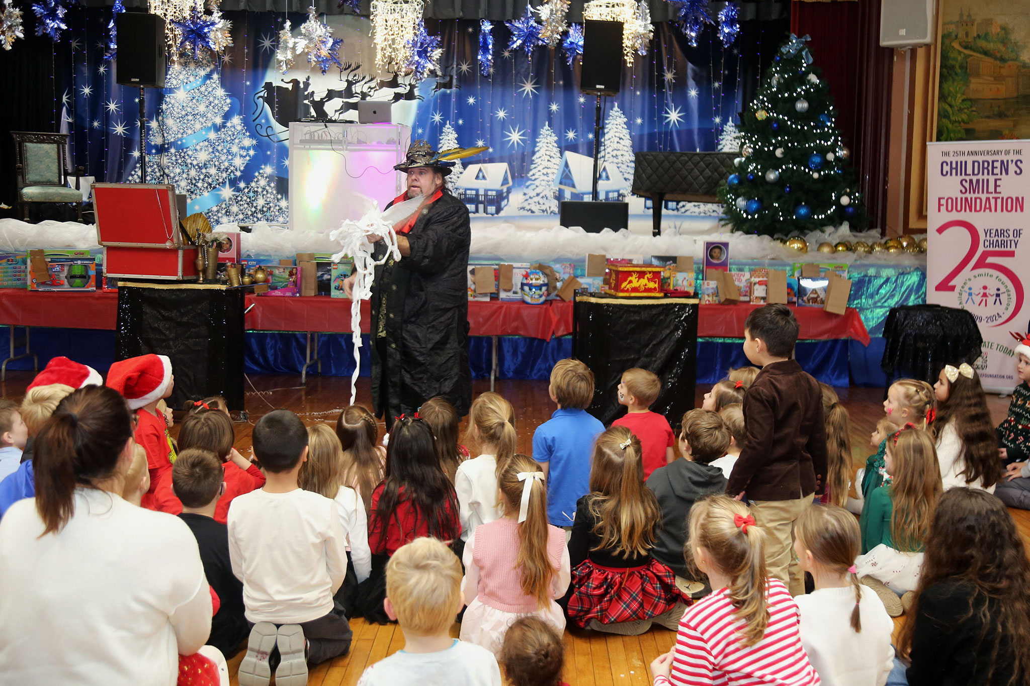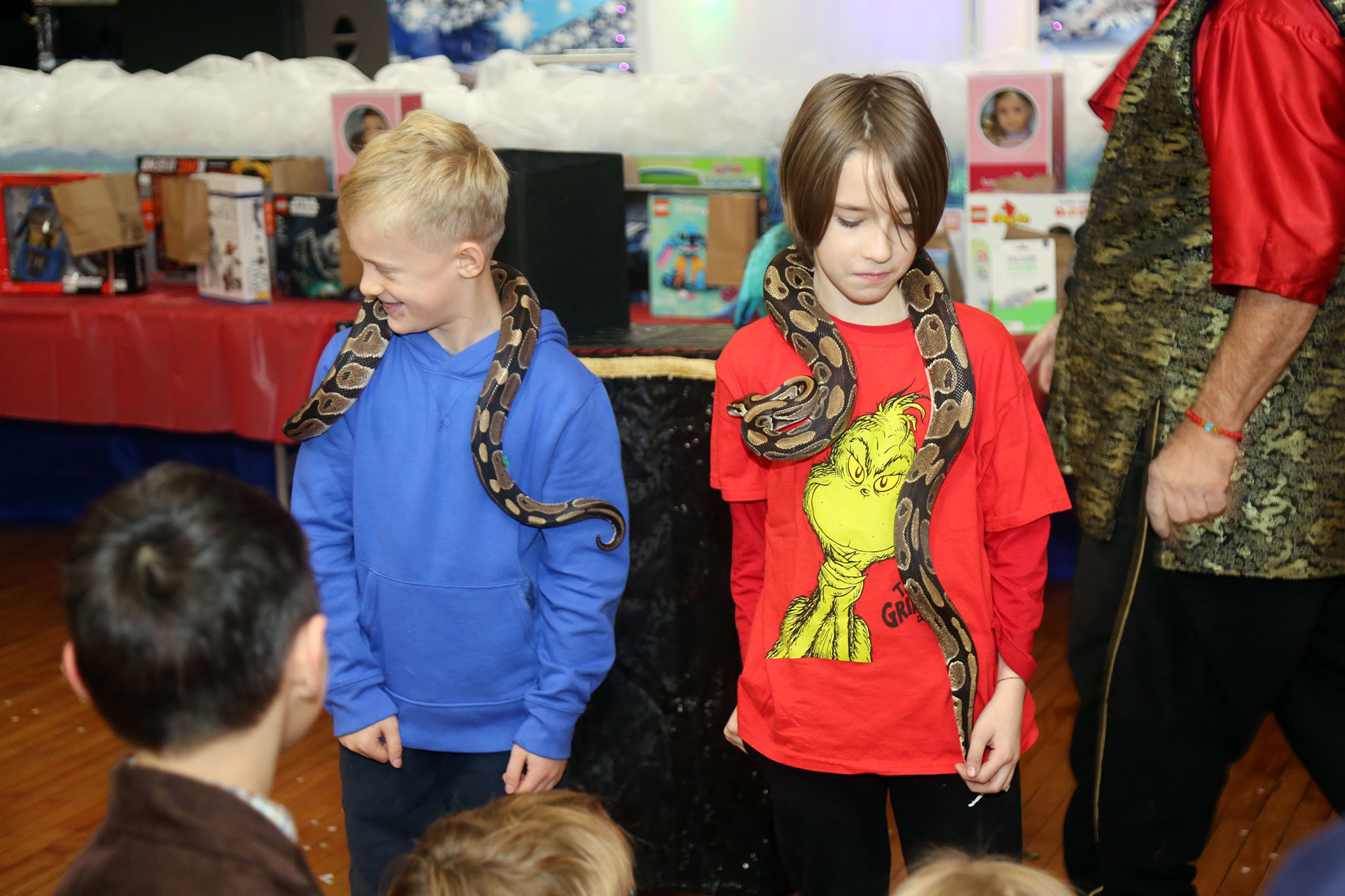 Niesamowitą popularnością wśród najmłodszych cieszyło się tzw. malowanie twarzy i robienie dziecięcych tatuaży. Maluchy mogły też otrzymać ulubioną bajkową postać zrobioną z balonów, a także spróbować waty cukrowej. Była również ulubiona przez dzieci pizza i ciasto, a także bigos i smażone kiełbaski dla ich rodziców. Ogromną furorę zrobił magik, który przez prawie godzinę czarował dzieci swoimi sztuczkami. Maluchy były zachwycone nie tylko jego pokazem, ale również gołębiami, papugą i przede wszystkim wężami, które miał ze sobą. Wiele z nich chętnie zakładało je na swoje szyje i pozowało do zdjęć. Jego pokaz wywoływał różnego rodzaju emocje, od śmiechu i radości, poprzez zdziwienie i podziw, aż po delikatne, krótkotrwałe przerażenie u niektórych maluchów. Tak było m.in. w momencie gdy magik zamienił gołębia w trzy węże. Jednak szybko wszystko wróciło do normy i dzieci z wielkim zainteresowaniem podziwiały kolejne triki magika. Po jego pokazie wszyscy bawili się na parkiecie przy świąteczno-tanecznej muzyce, którą serwował DJ Robert z zespołu The Masters. Po chwili pląsów z wolontariuszkami – Marleną Sokół i Emilią Felkner – maluchy zaczęły wywoływać Świętego Mikołaja, który wraz z kilkunastoma elfami dźwigającymi ciężkie prezenty pojawił się na sali.