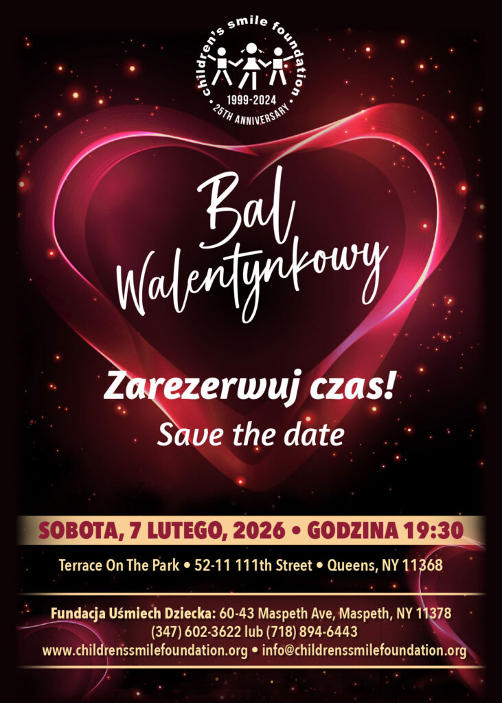 Zachęcamy do zarezerwowania czasu na doroczny Bal Walentynkowy 2026. Jego przyszłoroczna edycja odbędzie się w sobotę, 7 lutego, w pięknej balowej sali Terrace On The Park na Queensie. Początek o godz. 7:30 wieczorem. Tradycyjnie dochód z tej dobroczynnej imprezy przeznaczony będzie na rzecz dzieci pokrzywdzone przez los.